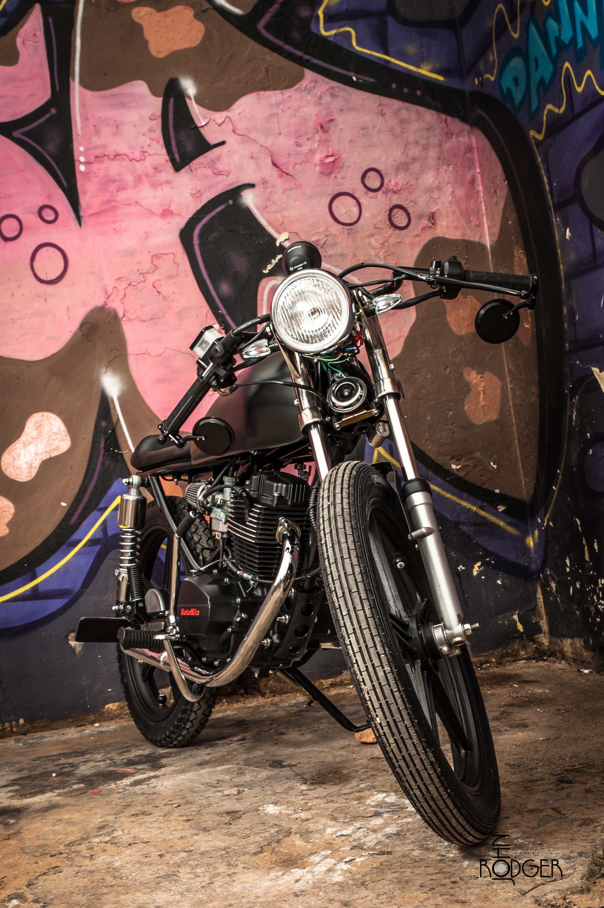 I recently did this MotoMia Cafe Racer shoot of a MotoMia bike that had been converted into a cafe racer by the guys at Retro Prestige Motorcycles. I wanted a graffiti wall as a background that we found in Woodstock. The model in the photos is Deon who also is the owner of the bike.